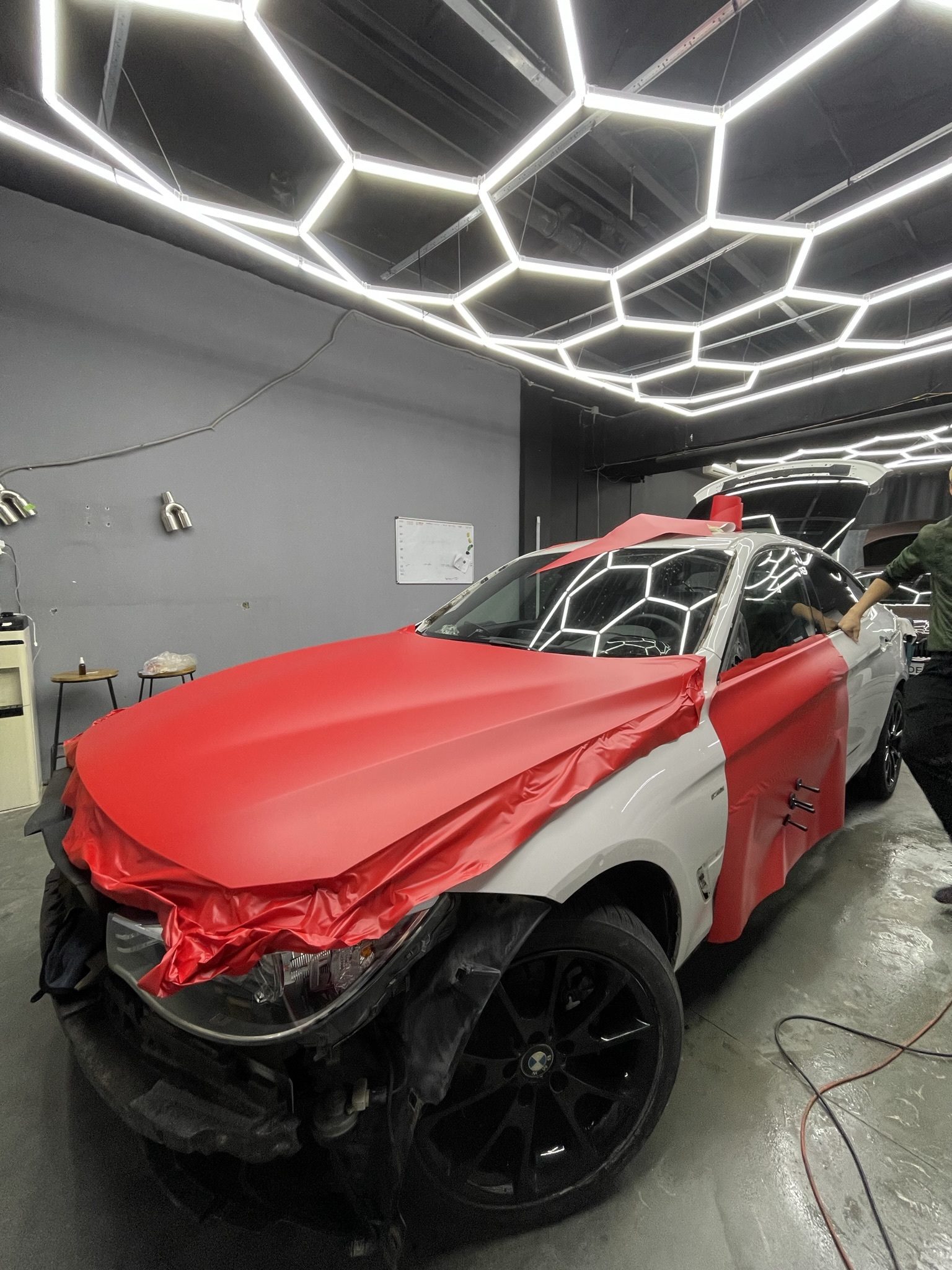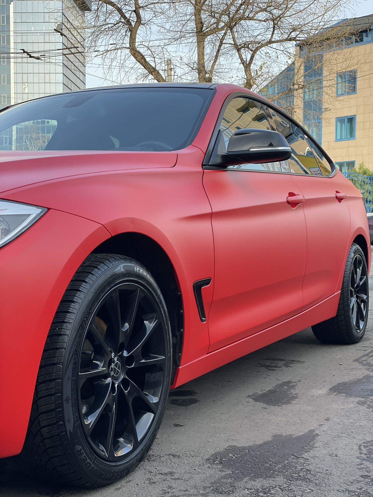 Полная оклейка BMW 3 в красную виниловую плёнку с выполнением стильного антихрома. Антихром выполнен с разбором деталей и подворотами пленки, таким образом значительно увеличивается срок эксплуатации антихрома. Для большей стилизации крыша и черкала были оклеены в черную ультраглянцевую плёнку.